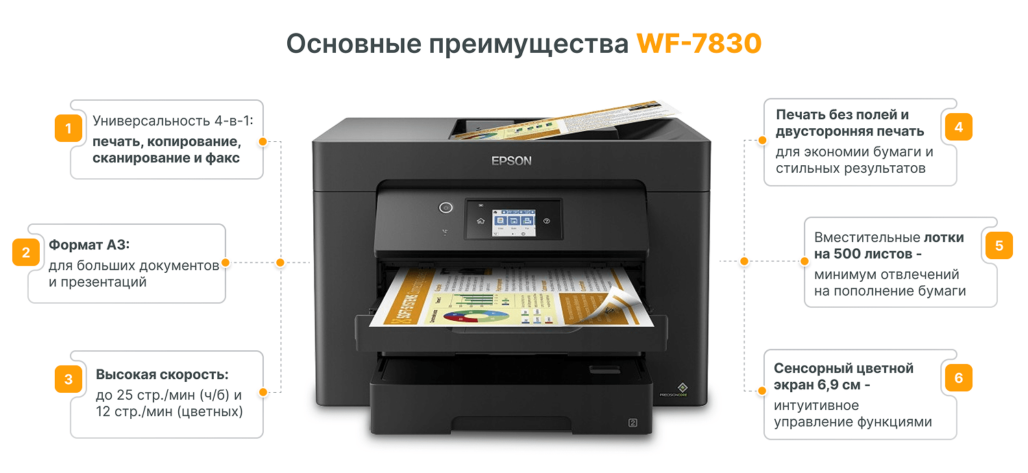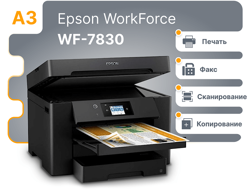 Epson WorkForce WF-7830 — это профессиональное офисное МФУ формата А3, которое объединяет печать, сканирование, копирование и факс. Оно станет надежным помощником в компаниях с большим документооборотом, обеспечивая скорость, высокое качество и удобство в ежедневной работе.