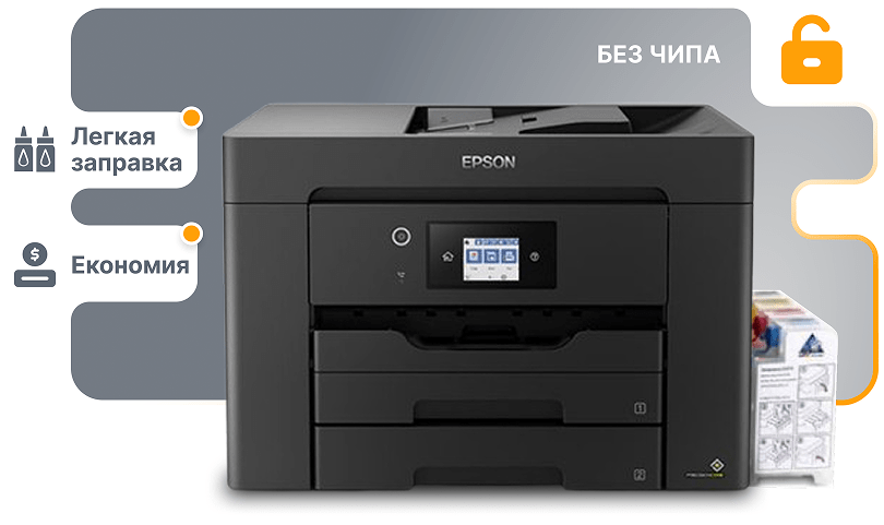 Приобретая Epson WF-7830 в комплекте с СНПЧ (система непрерывной подачи чернил) и бесчиповой прошивкой, вы получаете: