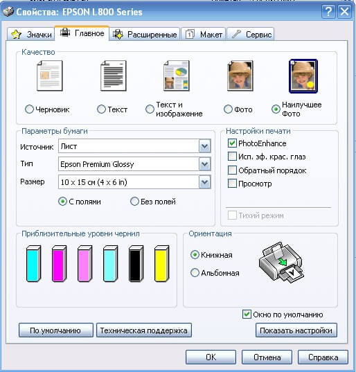 Выбираем такие настройки: Качество - Наилучшее фото/Best photo; тип бумаги - Epson Premium photo; размер бумаги (в данном случае А4). После этого следует перейти на вкладку Расширенные/Advanced и отметить все галочками, как показа но на скриншоте ниже: