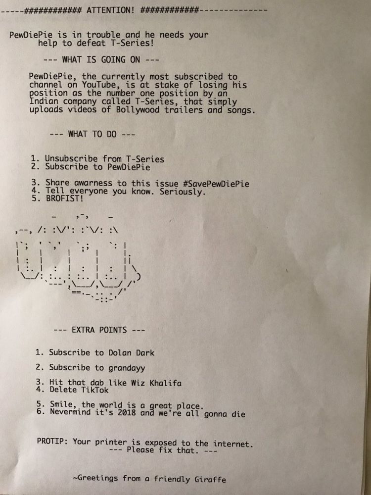 Владельцы печатающих устройств начали делиться в социальных сетях странными сообщениями с одинаковым содержанием, которые без какой-либо команды напечатали принтеры. В послании была просьба подписаться на канал некого PewDiePie на YouTube. Как стало известно позже, фанат шведского видеоблоггера Феликса Арвида Ульфа Кьелльбера или PewDiePie решил таким образом поддержать своего кумира.