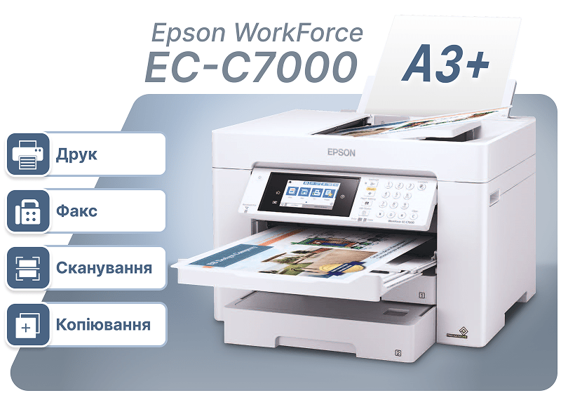 Багатофункціональний пристрій EPSON WorkForce EC-C7000 замінює відразу три види оргтехніки, виконуючи функції: