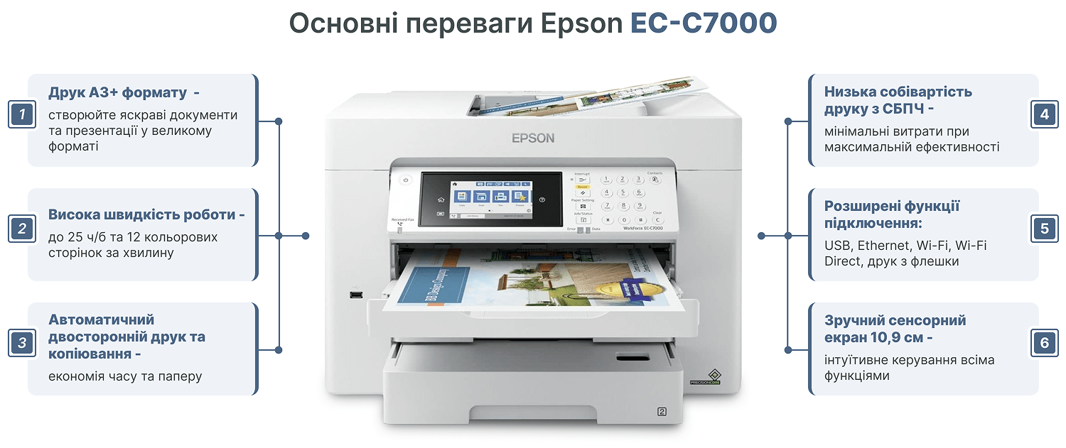 У БФП EPSON EC-C7000 використовуються інноваційні технології, які дозволяють: