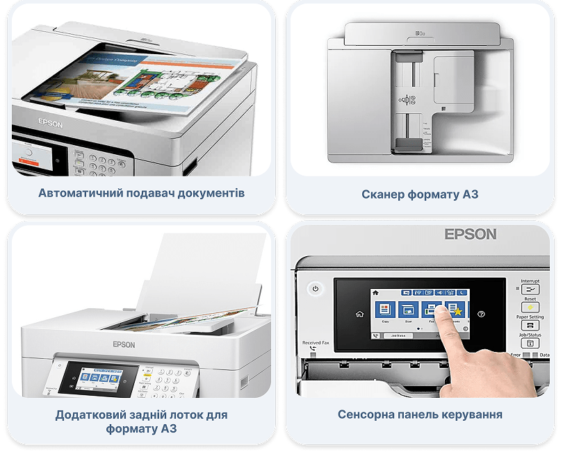 | Типи бездротового підключення | Epson Connect, Iprint, Email Print, Remote Print Driver, Scan-to-Cloud, Apple AirPrint, Google Cloud Print |