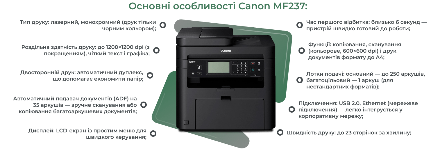 Canon i-SENSYS MF237w — високопродуктивний лазерний багатофункціональний пристрій з бездротовим підключенням та повним спектром офісних функцій. Ідеальне рішення для активних офісів, що потребують швидкого друку, якісного сканування та надійного факсового зв'язку в одному компактному пристрої.