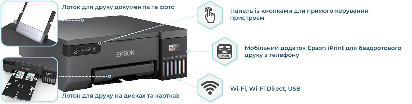| Типи бездротового підключення | Iprint, Epson Smart Panel App |